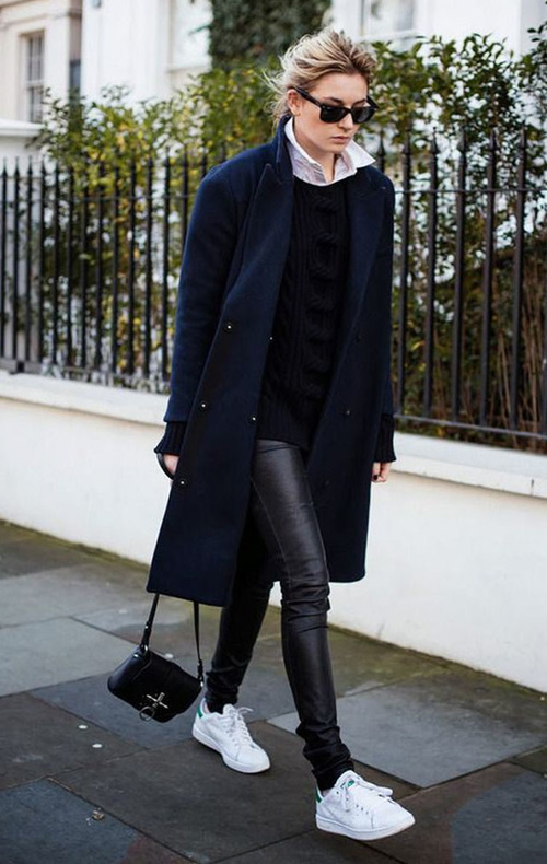 Tenis con Leggins de cuero negro.