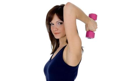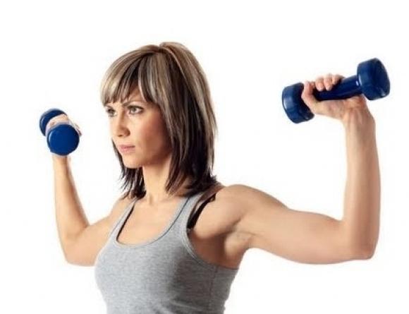 Con unas pesas levanta tus brazos hacia la parte de atrás de tu cabeza, baja tus brazos y vuelve a subirlos repite 8 veces, haz 3 series.
