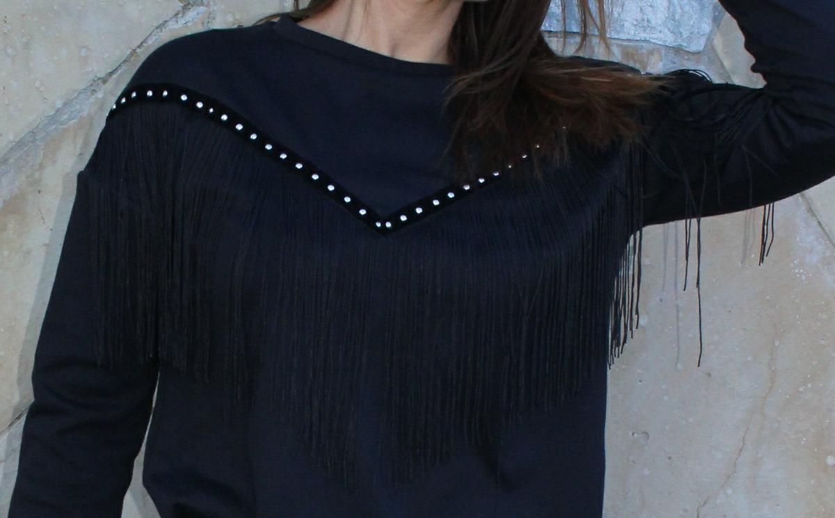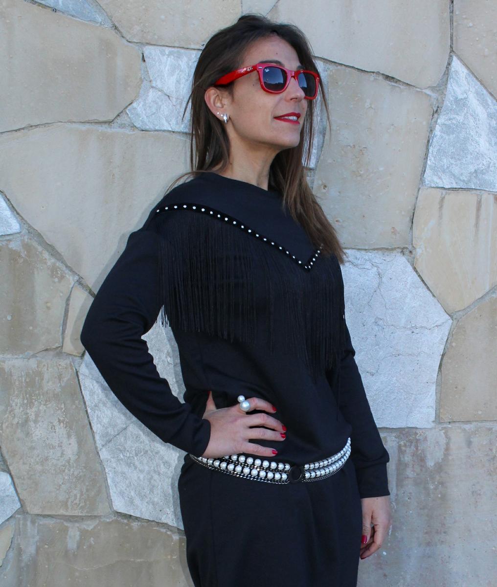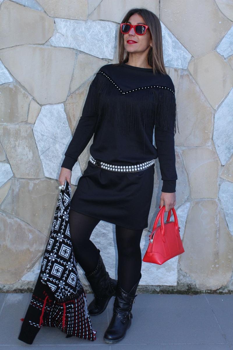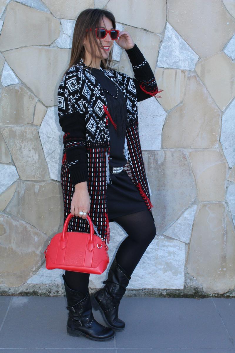 En el vestido que llevo en el look de hoy, adornan toda la pechera y partes de las mangas en forma de pico, rematados en la parte superior con pequeñas tachuelas. Como complementos a este estiloso vestido añadí un cinturón a la cadera compuesto por perlas y cadenas , botas moteras y chaqueta con bordados geométrico y flecos de lana. Un perfecto outfit casual-hippie-motero