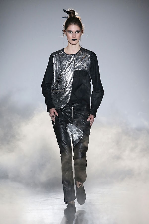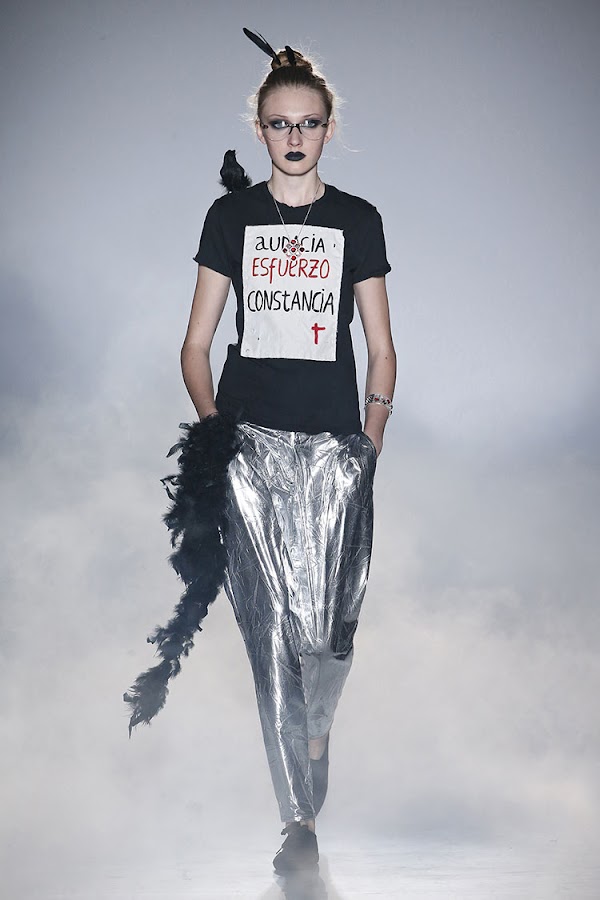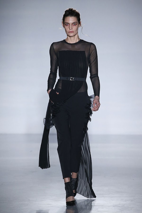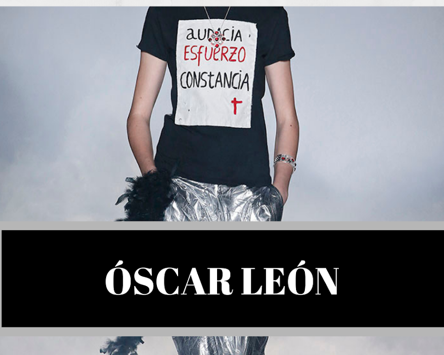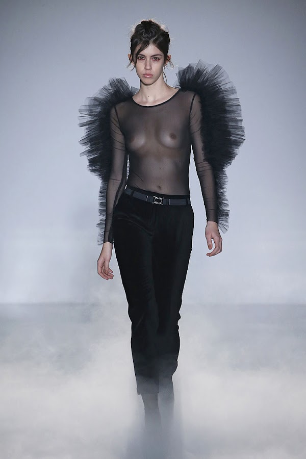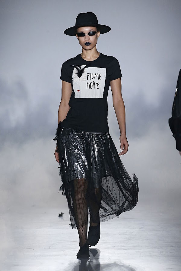 Con Plume Noir, Óscar León nos presentó su colección de invierno 2019/2020 de inspiración nocturna con negros y metalizados como principales colores, rodeados de materiales, vuelos, volantes y sobre todo plumas de aves (muy claras en mensajes de camisetas). Junto a todo esto, el sombrero se convirtió en uno de los complementos estrella de la colección, junto con los collares largos plateados y unos maquillajes en negro.