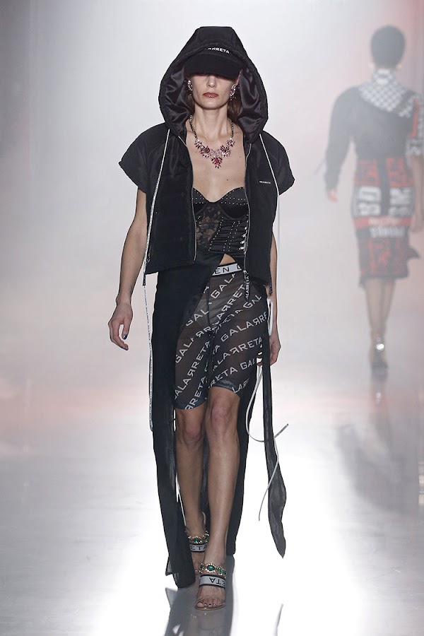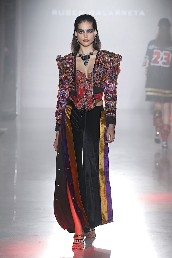 Rubén Galarreta fue una de las apuestas de color más atrevidas del desfile que tuve la oportunidad de poder ver. Su colección After Party logró sorprender con sus cortes, transparencias, brillos, lentejuelas y tiras cruzadas evocando a las noches más intensas y enérgicas del año. Para darle más fuerza todavía, acompañó de estampados, como el leopardo, los flecos, las chupas de cuero, tachuelas, transparencias y el nombre de la firma plasmado en cualquier espacio de la prenda.