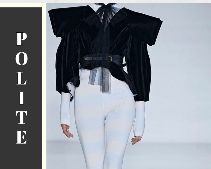 La temática central bajo la que gira la colección de Polite es en las migraciones y desplazamientos de las personas y animales. En ella, encontramos claras referencias a elementos con volumen, especialmente en el cuello y en los hombros con mantas isotérmicas doradas, así como con cuello tapados y altos y con espaldas amplias acompañadas de vestidos de corte sirena lleno de estampado y faldas midi. Los colores que abundaron fueron los blancos, negros, azules cielo o el rojo.
