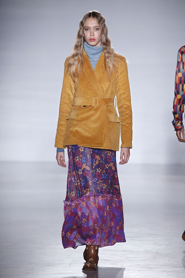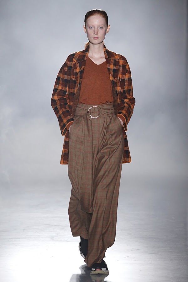El resto de la actuación gira alrededor de esta misma línea melódica que combinaba delicadeza con tonalidades suaves, color camel, ocre crema y negro con líneas muy sencillas sin grandes adornaciones con prendas de algodón, tela y neopreno, con algún lazo y/o volantes así como con algún estampado de cuadros en blazers. En cuanto a las prendas predominaron los delantales, los pantalones de peto, faldas de rayas con superposiciones faldas midi con superposiciones de falda. Todo en clave neutro con marrones, negros y blancos como principales protagonistas. Así también, mostró en algunas prendas una dualidad de edades mostrando la de niña y la de adulto.