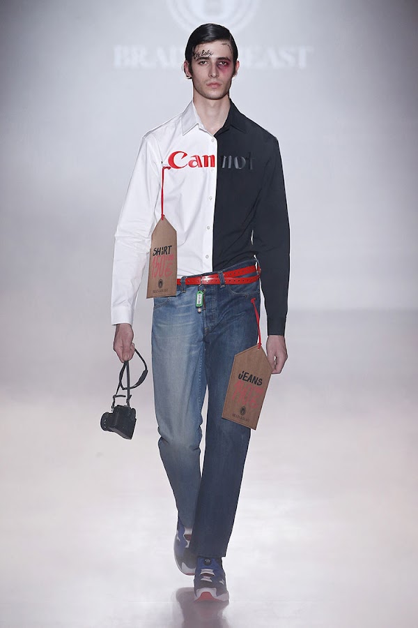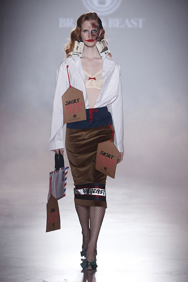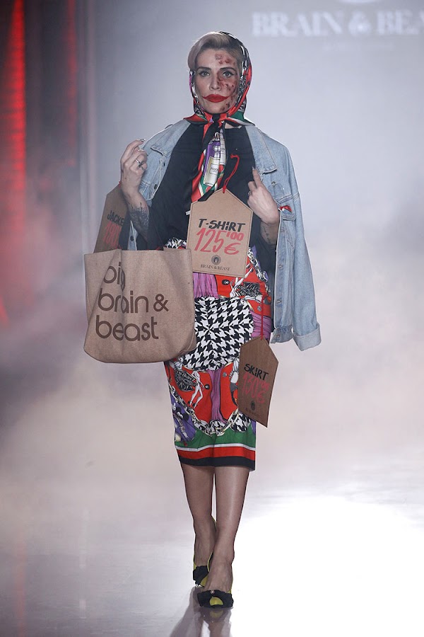 Brain & Beast vuelve a sorprender con una colección plagada de vinculaciones y referencias a otras firmas con finales un tanto reivindicativas en relación a la compra masiva. De ahí, que percibamos el logo de diferentes firmas con etiquetas y el nombre de la prenda en cuestión. Encontramos todo tip, que van desde un estilo más casual, para el día a día, hasta con un toque más elegante, gracias a faldas de estampados en tonalidades más vivas y meclando.