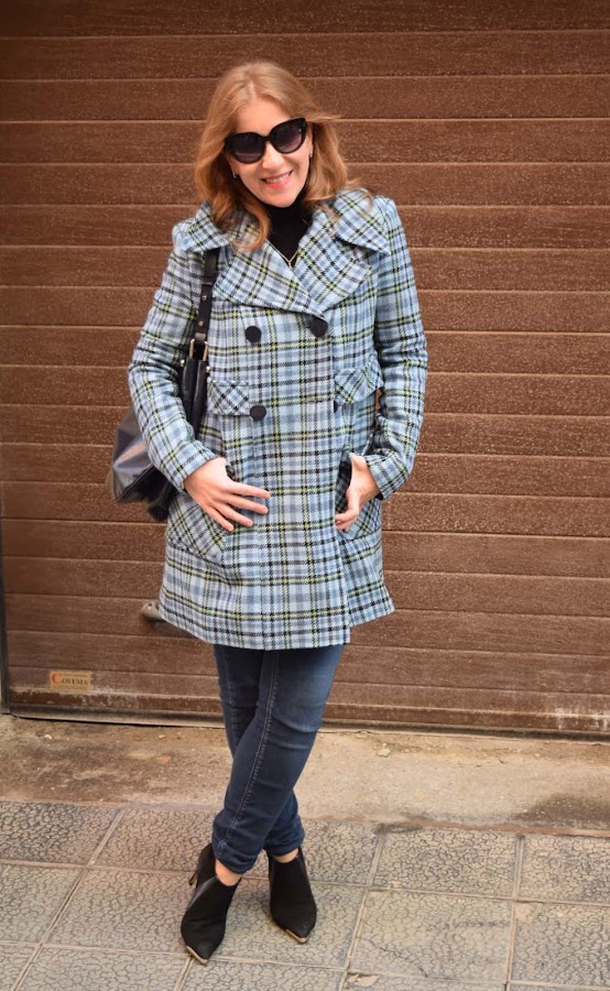 El protagonista, este abrigo de cuadros, que esta temporada arrasa como estampado preferido, en esta caso en colore azules más vivos, que alegran las mañanas más grises.