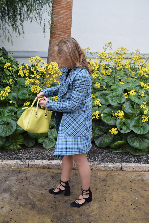 En esta ocasión elijo tonos que están incluidos en los cuadros del abrigo, como el color amarillo para llevarlo en un complemento, el bolso.