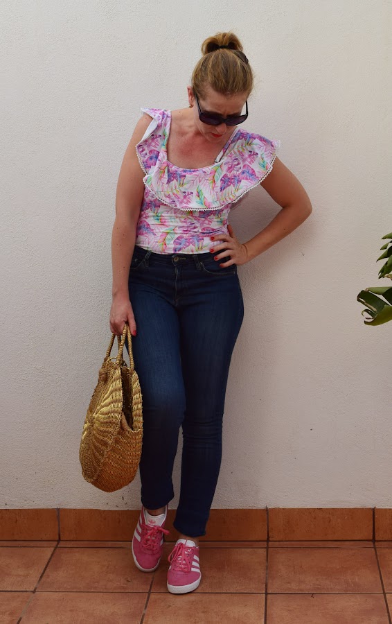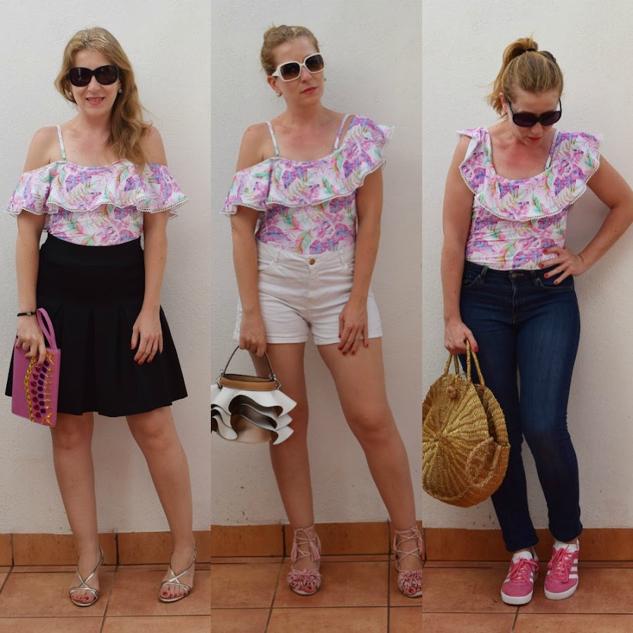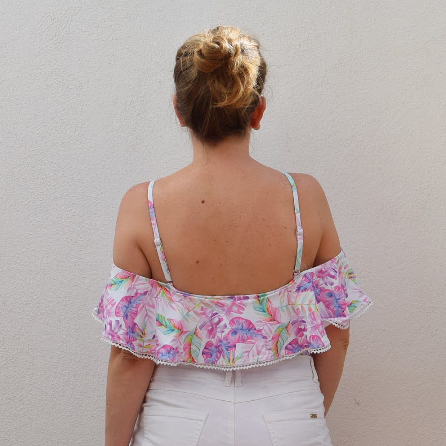 Tiene volante para dejar los hombros al aire o disponer de los tirantes según gustos; y un estampado veraniego total en tonos rosas. Lo que le hace perfecto para llevarlo para vestir combinado con otras prendas.