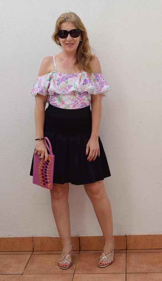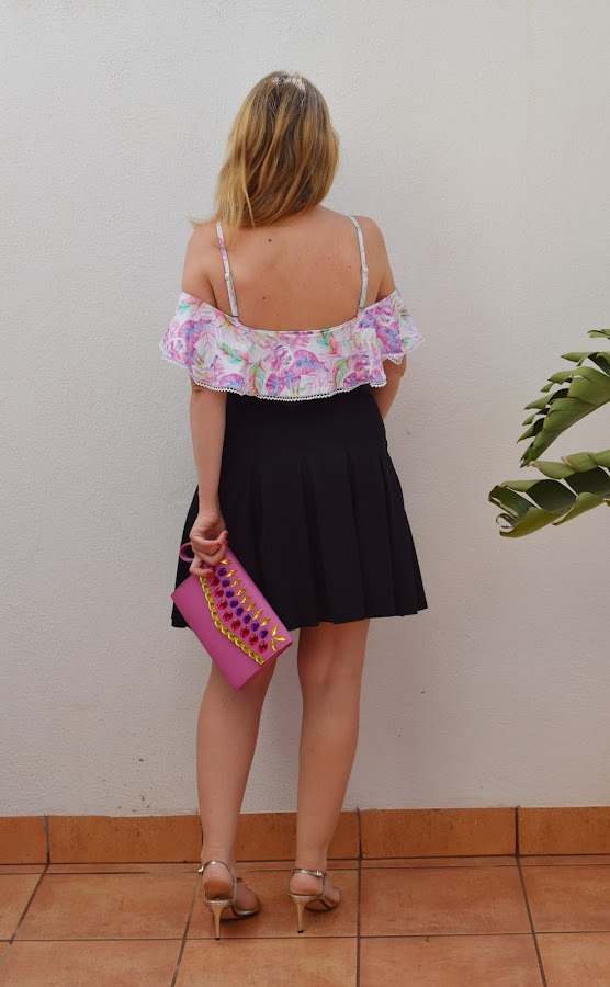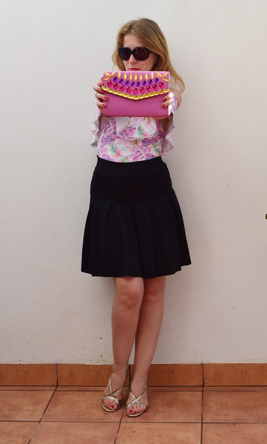 Con esta falda negra con un poco de vuelo, he conseguido un look muy apto para un día de trabajo, añadiendo unas sandalias y un bolso en los tonos del bañador.