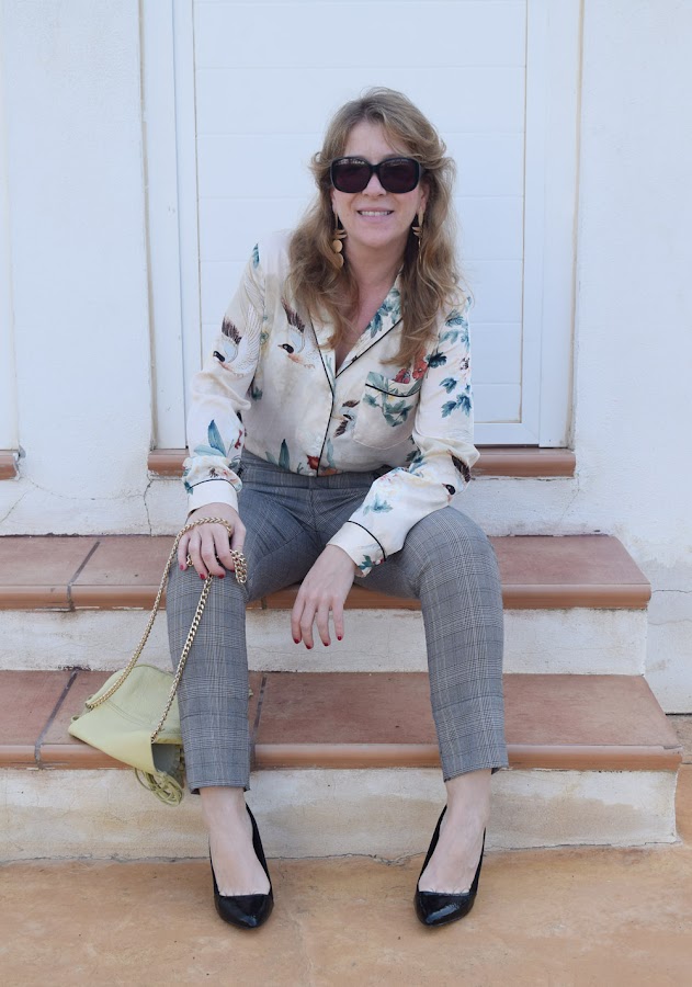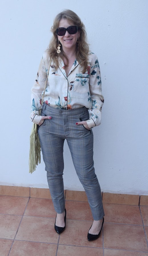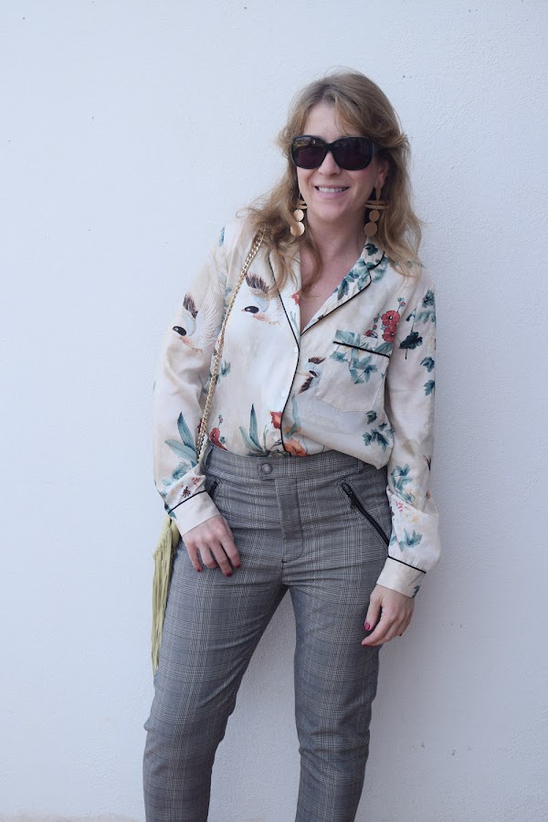 Cualquier tipo de camisa sirve para combinar con este pantalón. Desde las más sencillas en blanco hasta estampadas como esta con grandes flores y estilo pijamero. Añades unos tacones y un bolso para dar color y listo.