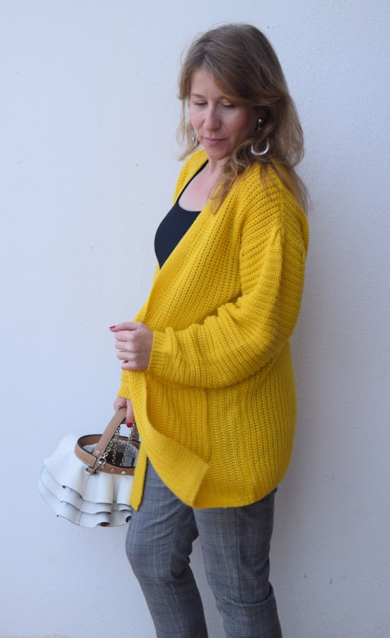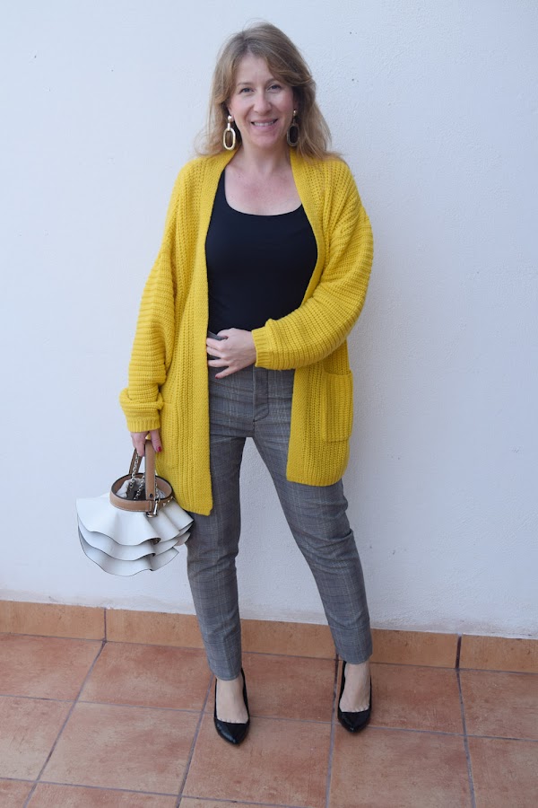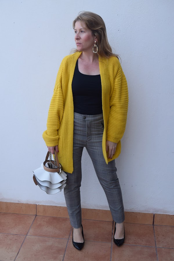 O roja, o verde, el caso es que la chaqueta sea de lana y gordita para poder prescindir de más prendas de abrigo. Como la chaqueta ya es bastante vistosa el resto de prendas las elegí monocromas, con un sencillo top negro y un bolso blanco.
