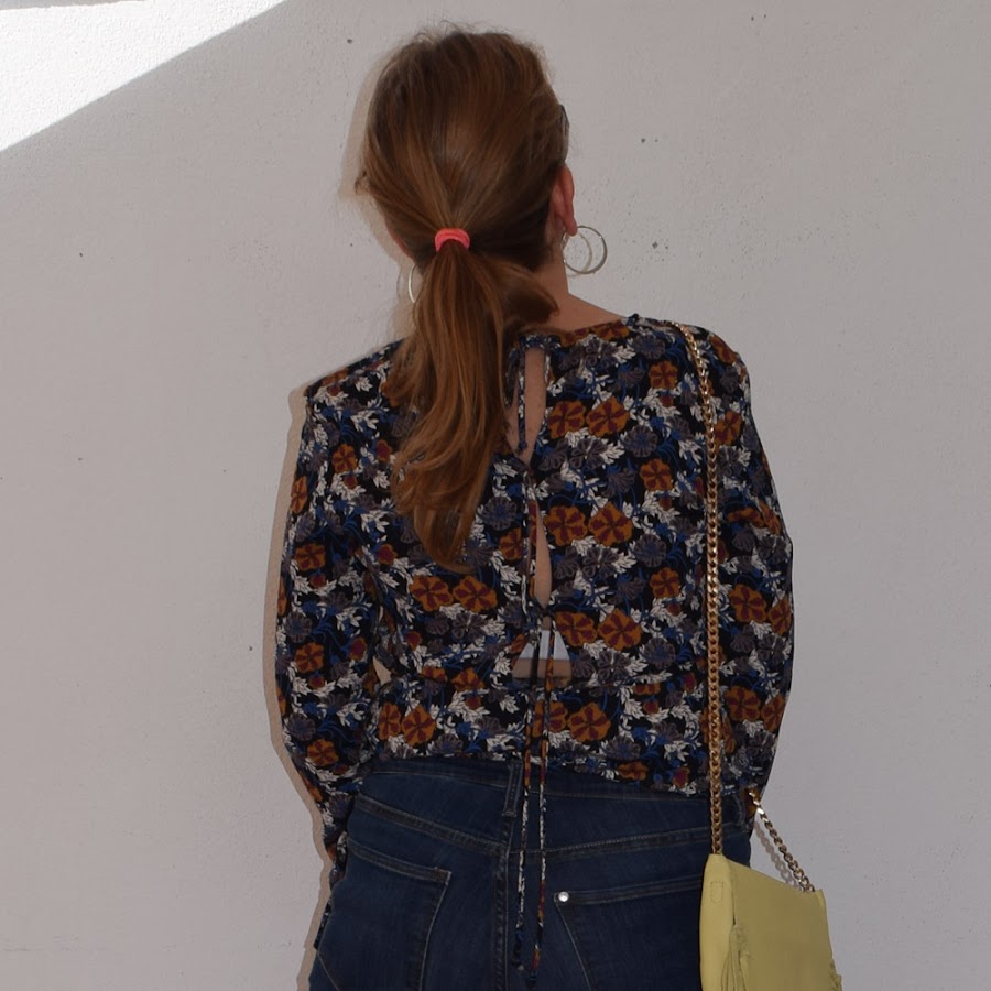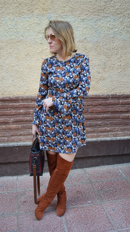 Este vestido es de tejido fino, de manga larga, y con la espalda en lazadas. Tiene unos colores 100% otoñales, aunque también le he dado mucho uso durante la primavera y finales del verano que no acaba.