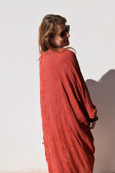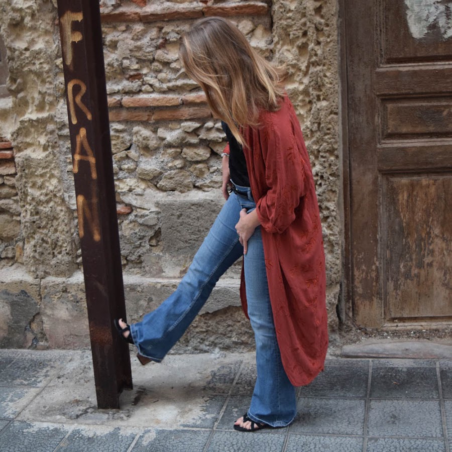 Si hace unas semanas proponía varias formas de llevar un kimono de flores, hoy vengo con un kimono más clásico, en color rojo teja, que permite combinaciones de todo tipo y más otoñales.