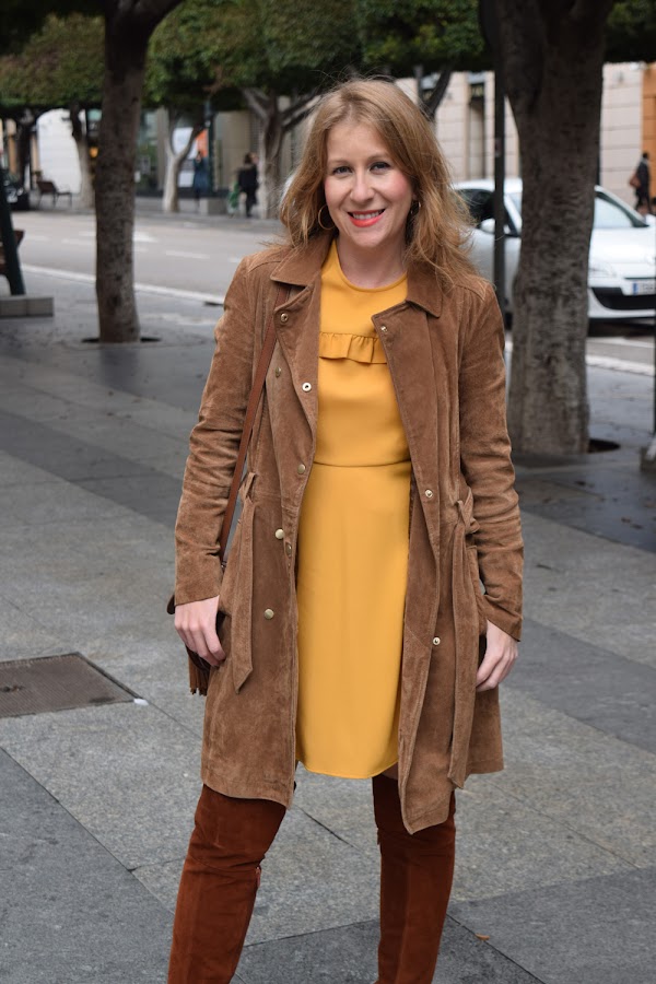De nuevo color para combinar con el marrón, es este caso amarillo o mostaza en forma de vestido.