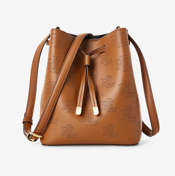 Bolso tamaño pequeño tipo saco de Ralph Lauren en color camel con detalle del logo perforado, de 209€ a 83,60€.