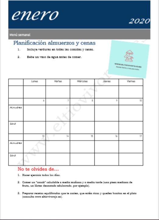 2. Planifica los almuerzos y las cenas de lunes a viernes y, si es posible, prepara la comida con antelación. Además de ahorrar tiempo y esfuerzos, el hecho de tener la comida preparada con antelación te hará sentir más determinación y tendrás menos deseos de comer cosas inapropiadas. Descárgate aquí la plantilla para planificar estas dos primeras semanas de enero (pincha aquí para abrir el archivo con la plantilla). Ponla una vez completada para que puedas verla cada día. Te ayudará además a planificar mejor tu compra y a ahorrar dinero.