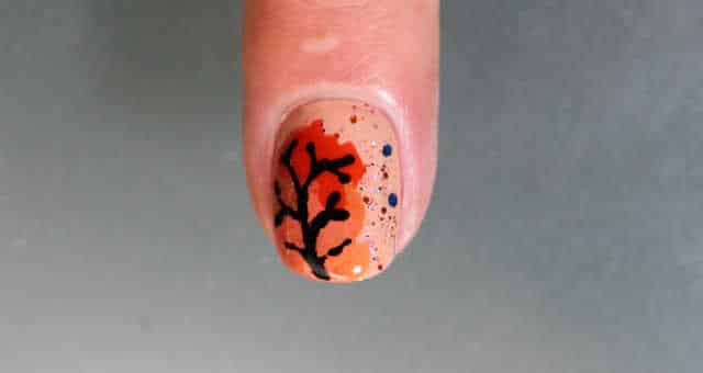 Con una base oscura usaremos un esmalte con purpurina y colores otoñales. Después sobre esta base haremos una mancha de colores rojizos que será la copa del árbol. Después con un palillo y esmalte negro dibujaremos las ramas y el tronco del árbol con mucho cuidado.