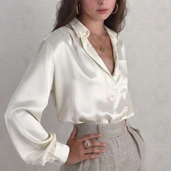 Debes tener una blusa o camisa en color natural, puede ser de algodón e inclusive de seda. Elige un corte flojito, para nada debe quedarte pegada al cuerpo. Las camisas o blusas de este tipo podrás combinarlas absolutamente con todo y por la calidad de la tela siempre te veras elegante.