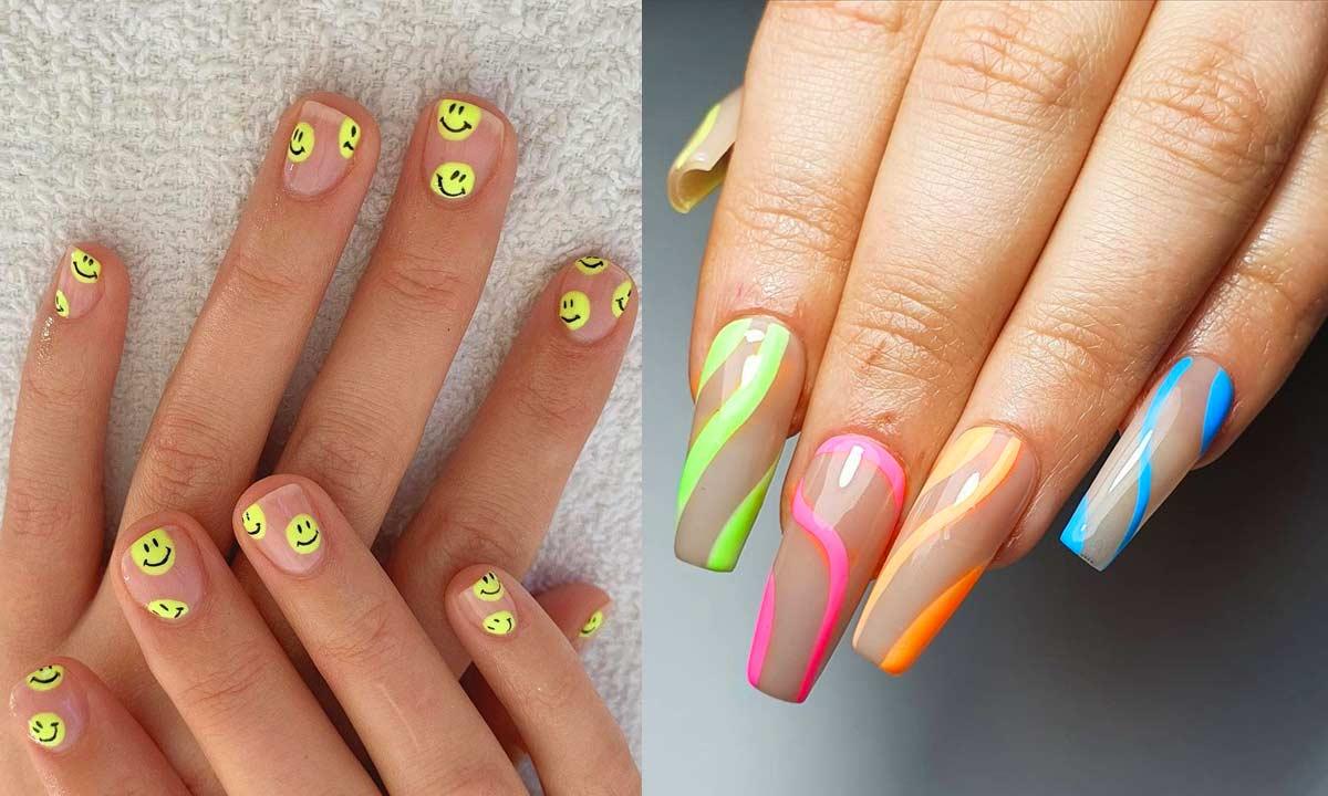 El Neón nunca pasa de moda, especialmente en verano, pero este año tenemos una variante más sencilla y quizás algo más discreta. Se trata de combinar un tono nude con detalles de nail art en tonos neón. Una de mis favoritas de este año son las uñas con smileys.