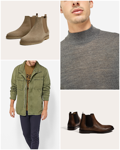En cuanto al calzado, si en en el terreno femenino veíamos los botines calcetín, para hombre los botines chelsea vienen muy fuertes y los podemos encontrar de muchos estilos y materiales diferentes, desde casual hasta en clave más formal. Mis favoritos sin duda son los de ante, que es un material que me encanta para el otoño y que combinados con camisas militares hacen unos conjuntos geniales para el día a día o también con un look total denim. Por otra parte, los de piel, combinados con unos pitillos y una blazer me parecen una combinación excelente. Y si le sumas el jersey de cuello perkins o cuello vuelto, tienes un conjunto de 10.