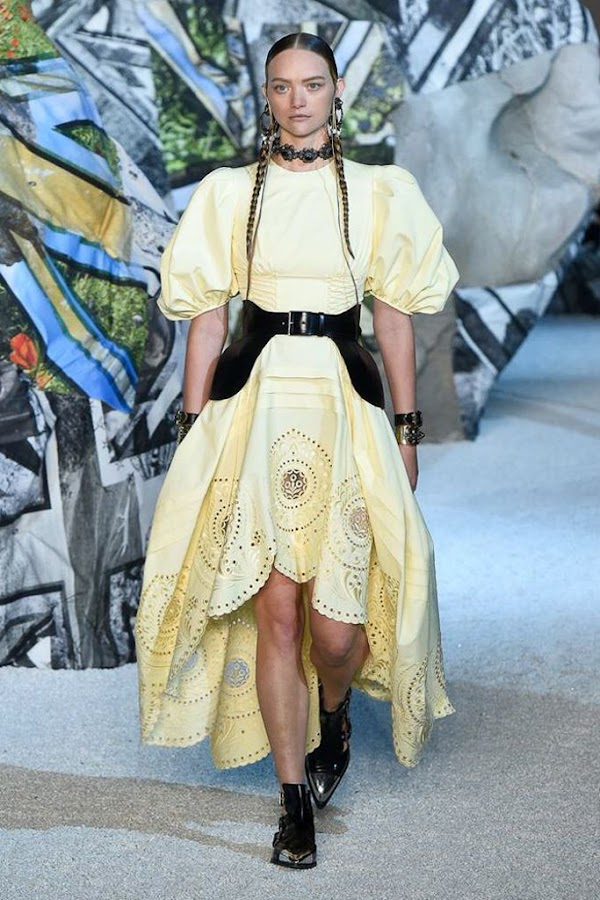 Otra tendencia que hemos visto en muchos desfiles son los vestidos de estética victoriana, con mangas abullonadas, bordados y pliegues. Un estilo romántico del que puedes encontrar prendas en casi todas las tiendas. Imagen del desfile de Alexander McQueen.
