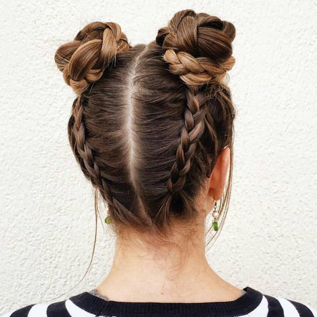 Cómo peinar: estas trenzas son tan delicadas y perfectas que tal vez quieras visitar a una estilista para que te ayude. Opta por las trenzas delanteras, y ponlas en bollos espaciales elegantes .