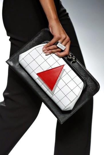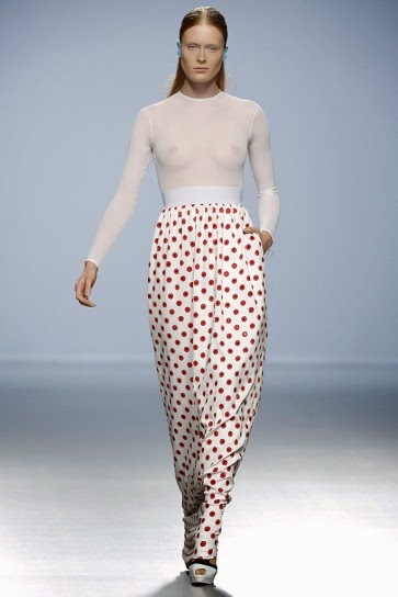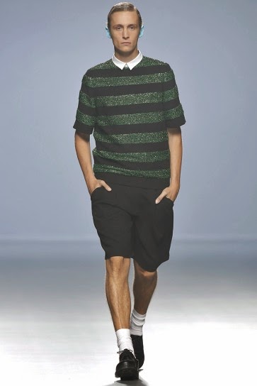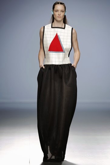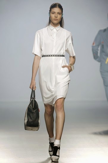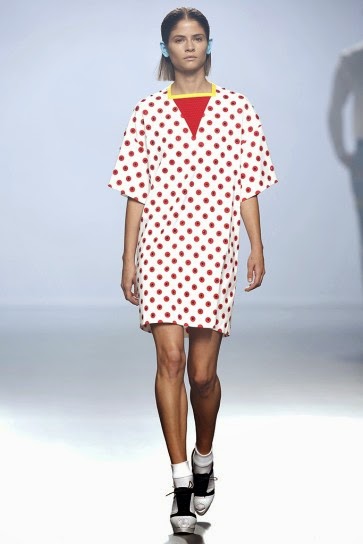 Color verde bola, blanco y negro, rojo lunar, azul ? vestidos rectos hasta la rodilla, camisas, tejidos con las letras de la firma con un aire clásico son algunas de las prendas que nos mostró.