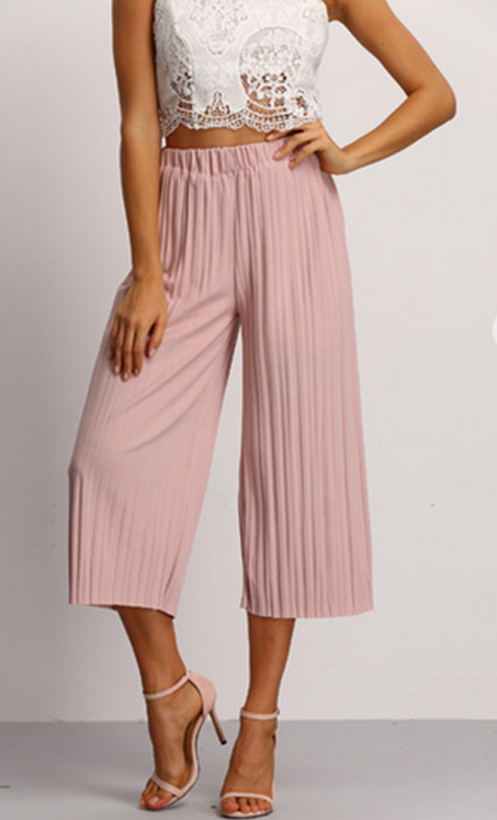 En el apartado pantalones, los culottes son una de las prendas estrella de este verano, así que no pueden faltar en nuestra maleta. Sirven para ir arregladas con un crop top y tacones, o con estilo más informal si las llevamos con sneakers. Estos en tela fluida y plisada me parecen súper estilosos y fresquitos: