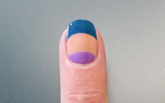 Este otro diseño de uñas combina colores sobre un fondo nude. Vamos a realizarlo con un pincel fino. Primero usaremos un lila y pintaremos un semicírculo en la base de la uña. Dibujaremos el contorno y luego lo rellenamos. Después vamos a repetir el proceso en la punta de la uña con un azul.