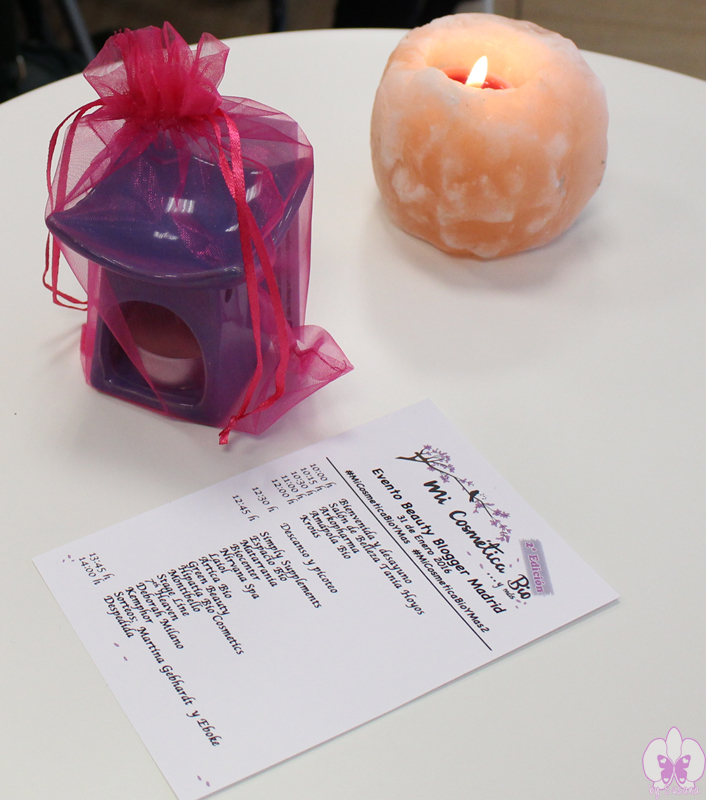 A las 10 de la mañana todas las invitadas al evento ya estaban allí y dimos comienzo a la 2ª edición de Mi cosmética Bio y más, con un detalle de bienvenida (un quemador de esencias) y el listado de como iba a transcurrir el evento.