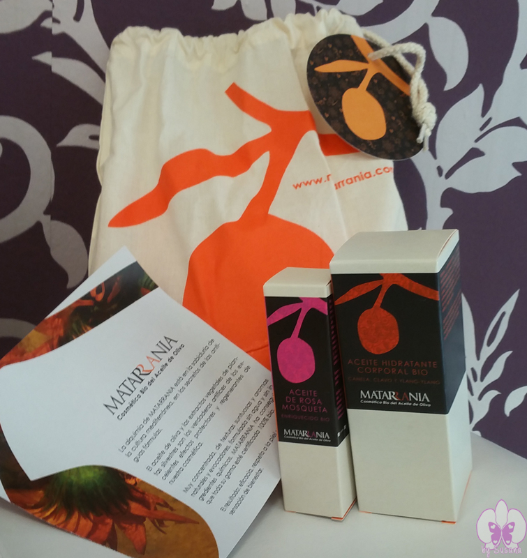 Matarrania es una de mis marcas favoritas de cosmética ecológica en cuestión de aceites y demás y también estoy enamorada de sus envases, de cristal de diferentes colores según el producto o la línea, ¡son preciosos!. Nos enviaron para el evento uno de los packs, compuesto por la bolsa 100% algodón ecológico que incluía su aceite de rosa mosqueta y el aceite corporal bio de canela, clavo y ylang ylang. Os contaré más sobre ellos.