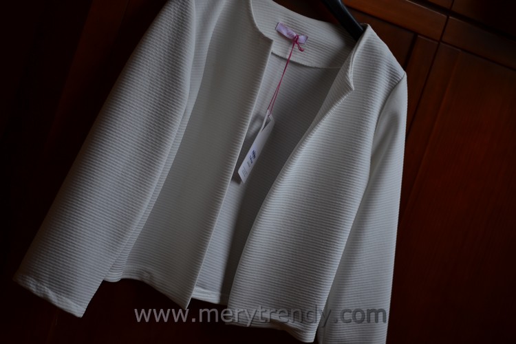 El caso es que, como me gustó tanto, decidí llevarlo también a la Comunión de mi sobrino ayer domingo, como veis en la siguiente imagen, para lo que opté por complementarlo con una chaquetilla torera en blanco de esta temporada de la tienda low cost Sk Moda para cuando refrescara.