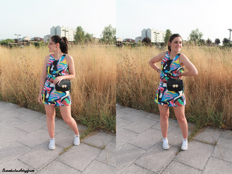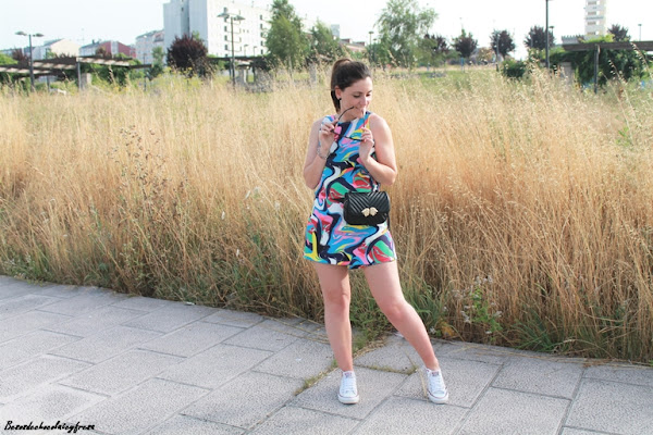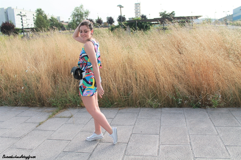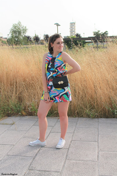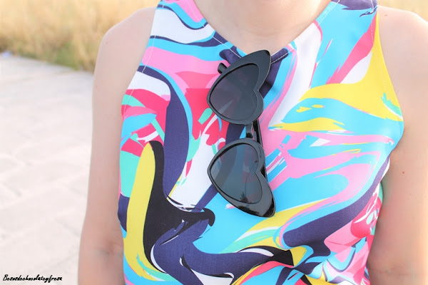 En esta ocasión me decanté por este 2 piezas multicolor y de estampado abstracto pues no tiene ningún dibujo particular en color azul, amarillo, azul, blanco, negro...donde las posibilidades a la hora de combinar por separado son múltiples debido a la gran cantidad de colores. Compuesto por top con abertura en la espalda y falda/pantalon (por delante simula falda y por detras es un short) y como complementos aposté por riñonera en negro, sneakers blancas y un toque divertido y lolita con mis nuevas gafas de corazón en color negro.
