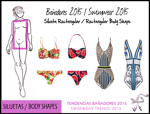 With this body shape, the objective is to smooth the rightness of their lines and define the waist, to make it get as close as possible to the perfect hourglass silhouette. We will achieve this by using at the top bandeau or foulard type bikinis fitted with padding. We also will prefer the lower-cut leg panties and low cuts, which will help us gain visual spaciousness hip. In case of full swimsuit choice, will choose those that enhance the waist with cuts and ornaments, and keep in mind that the trikini is also a very interesting option for this type of body.