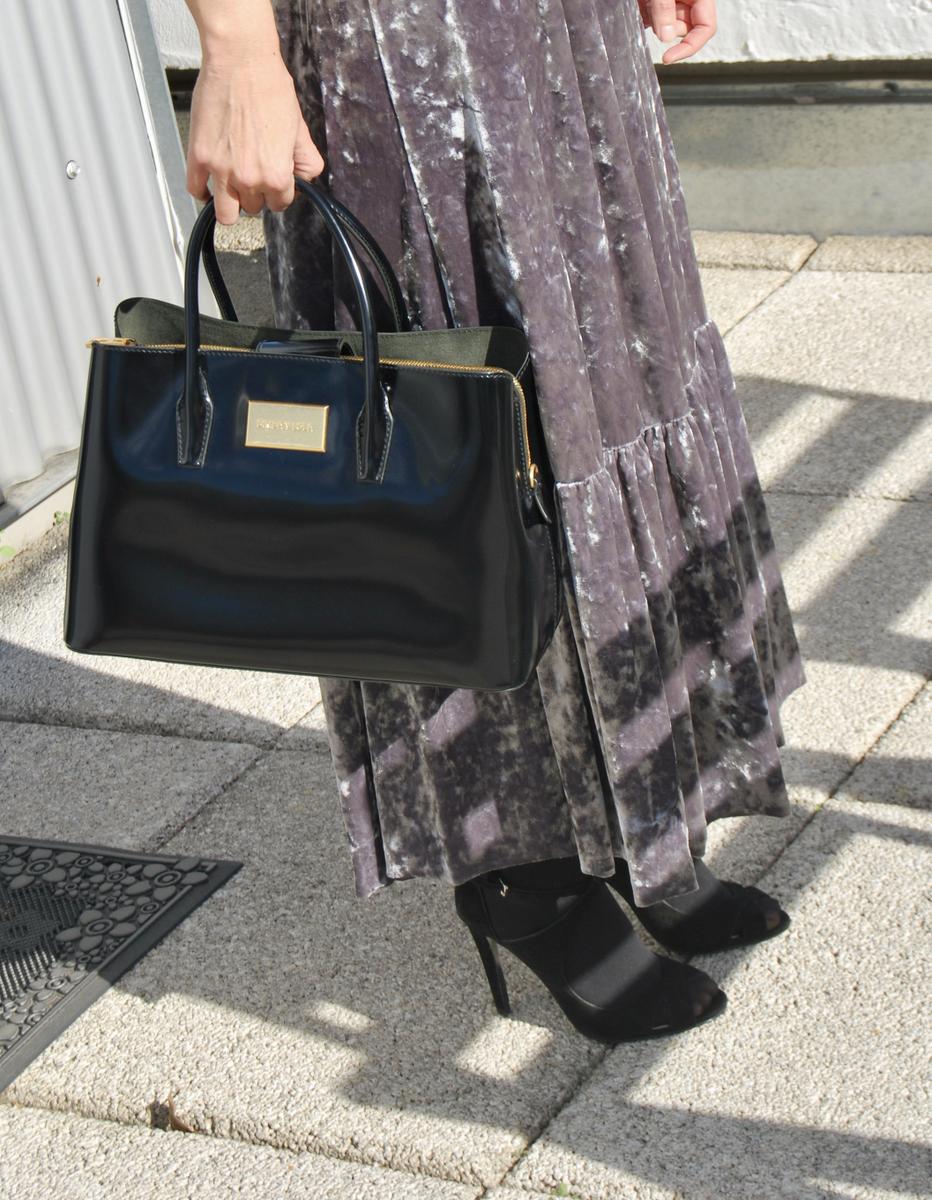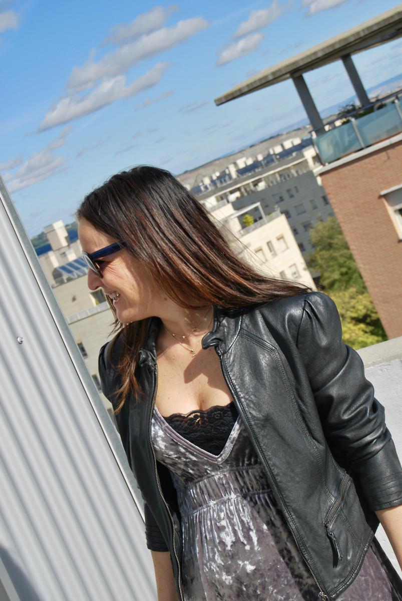 Un vestido de terciopelo con un gris precioso, bueno en si el vestido es una pasada, como te decía, de terciopelo gris, escote pronunciado al que yo le puse un sujetador de encaje negro, pero que queda genial con una camiseta blanca debajo del vestido o camisa estilo romántico, lo combiné también con sandalias negras de tacón y perfecto de cuero que como siempre te digo, le da a cualquier look un toque distinto. También lo combiné con bolso negro, el cual le robé a mi hermana porque desde que se lo vi, tuve ganas de robárselo y así hice…
