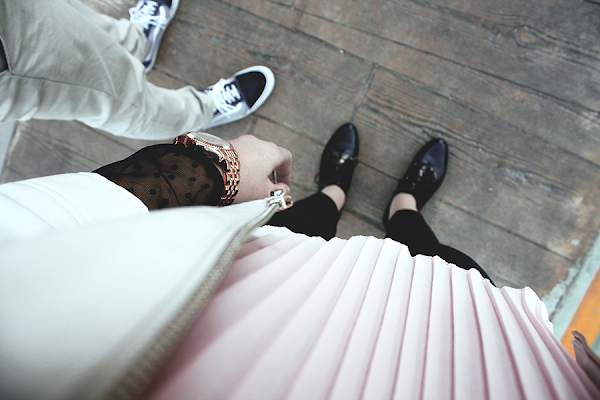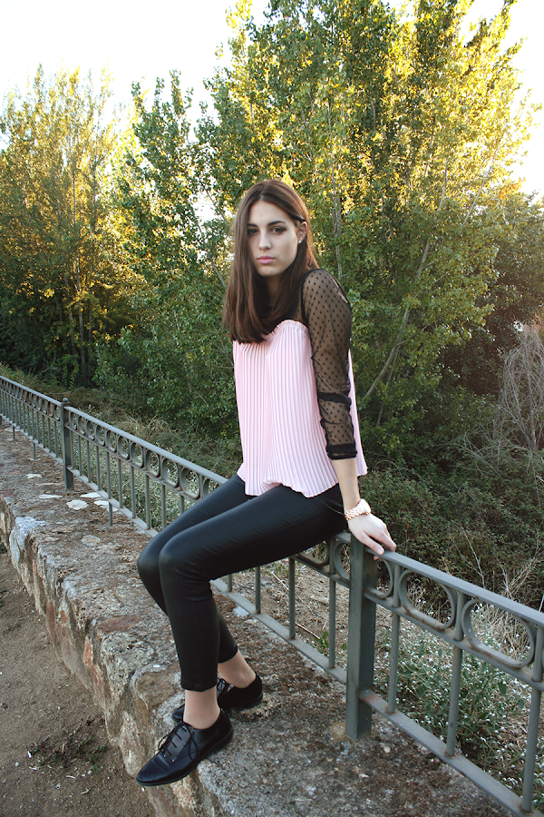 Sandra del blog Sanforiciare ha combinado sus zapatos masculinos con unos pitillo de cuero negro, y una preciosa blusa rosa y negra, que me parece de lo más sofisticada y elegante.
