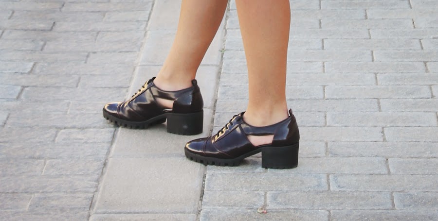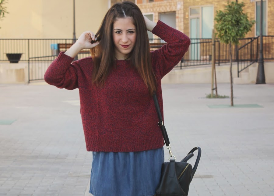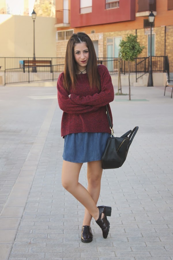 We decide to show you three differents ways to wear male shoes, like oxford, because theyre trendy and I love it so much! However my look is so female and chic. Im wearing a jersey colour Marsala, the star colour this autumn and winter, and a denim skirt.