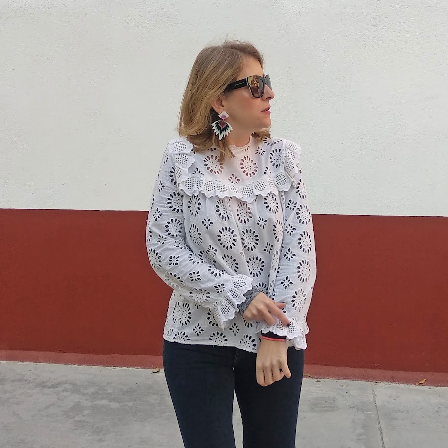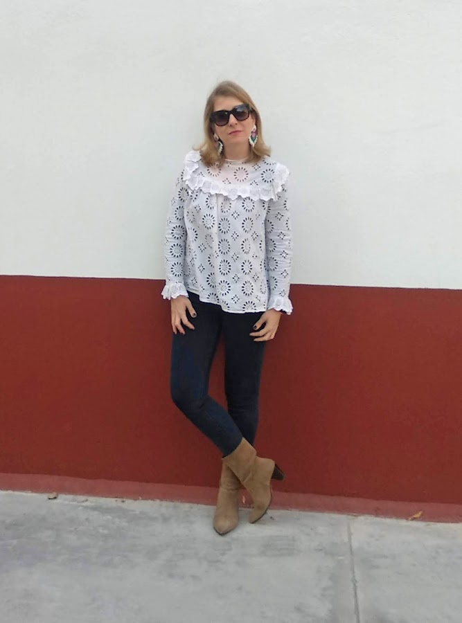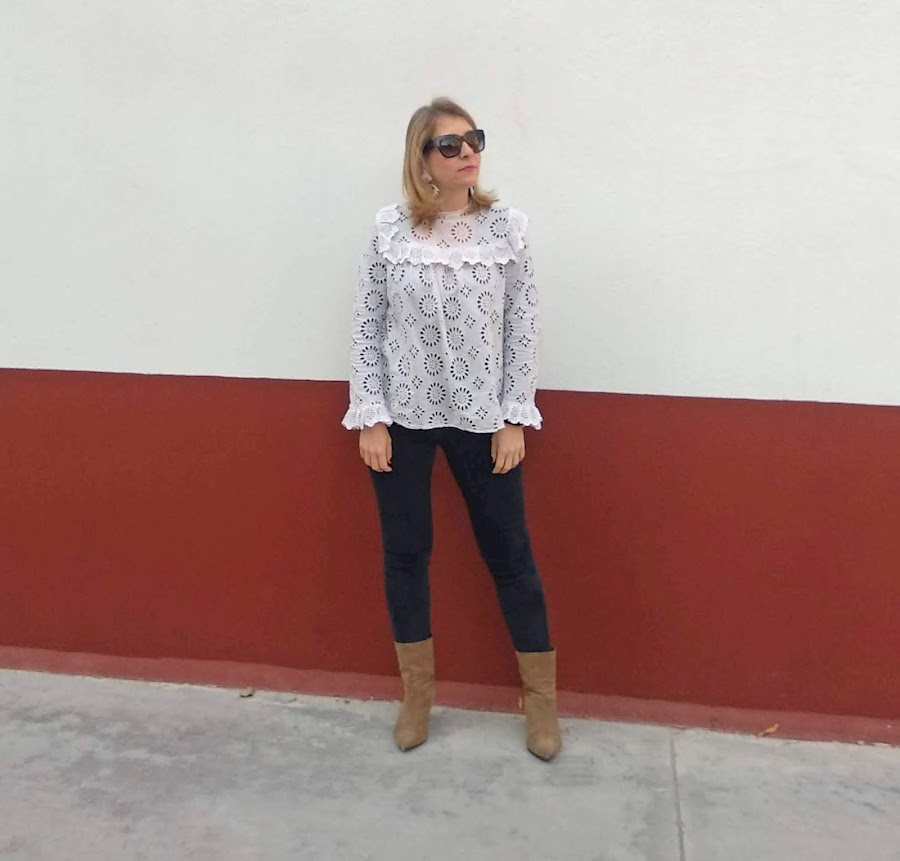 Look 1. Pantalón vaquero + blusa blanca + botines marrones