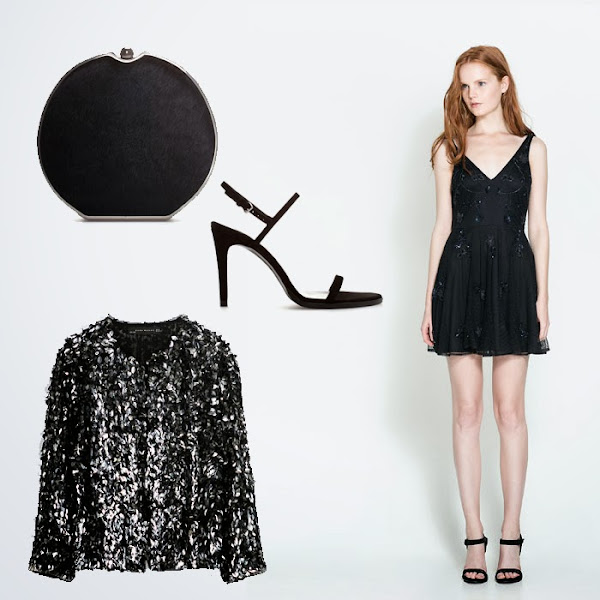 Las lentejuelas, los brillos y el negro también son combinaciones muy recurridas para final de año. Podéis combinar un vestido negro liso con una chaquetita más llamativa, o con un bolso más trabajado. Para algo de última hora es súper recomendable aprovechar algo que tengamos ya en casa y complementarlo con prendas en tendencia o más llamativas para cambiar el look. Aquí os dejo los precios y las tiendas de las prendas que os muestro para este look.