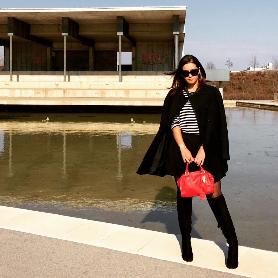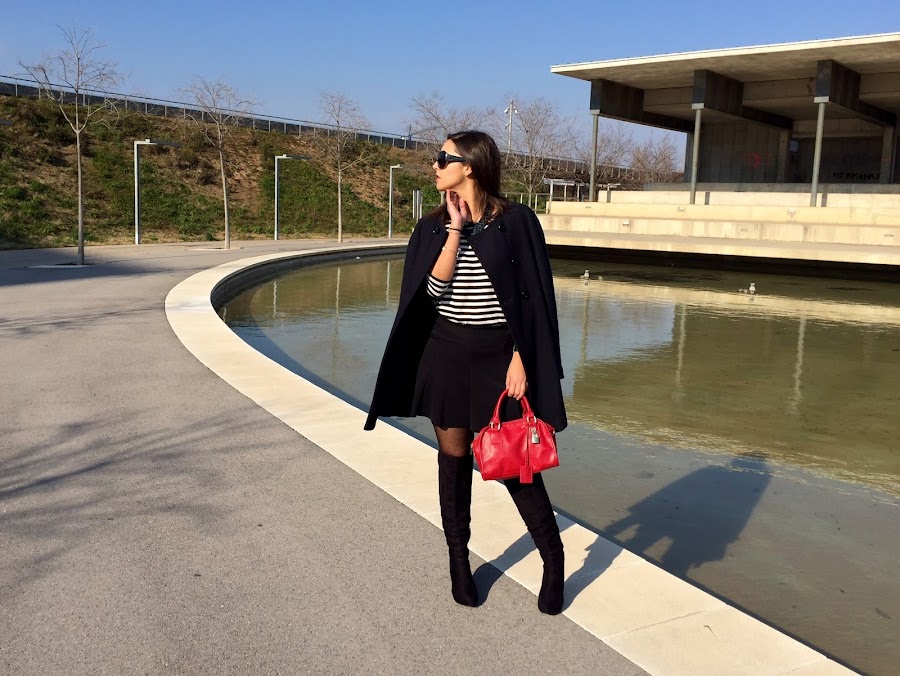 El último look que os propongo es un look con falda y camiseta de rayas con una botas por encima de la rodilla, tan de tendencia esta temporada. Para darle un toque de color al look, nada que un bolso en color rojo, el color del amor. Un look muy femenino y chic, que os mostré en este post.