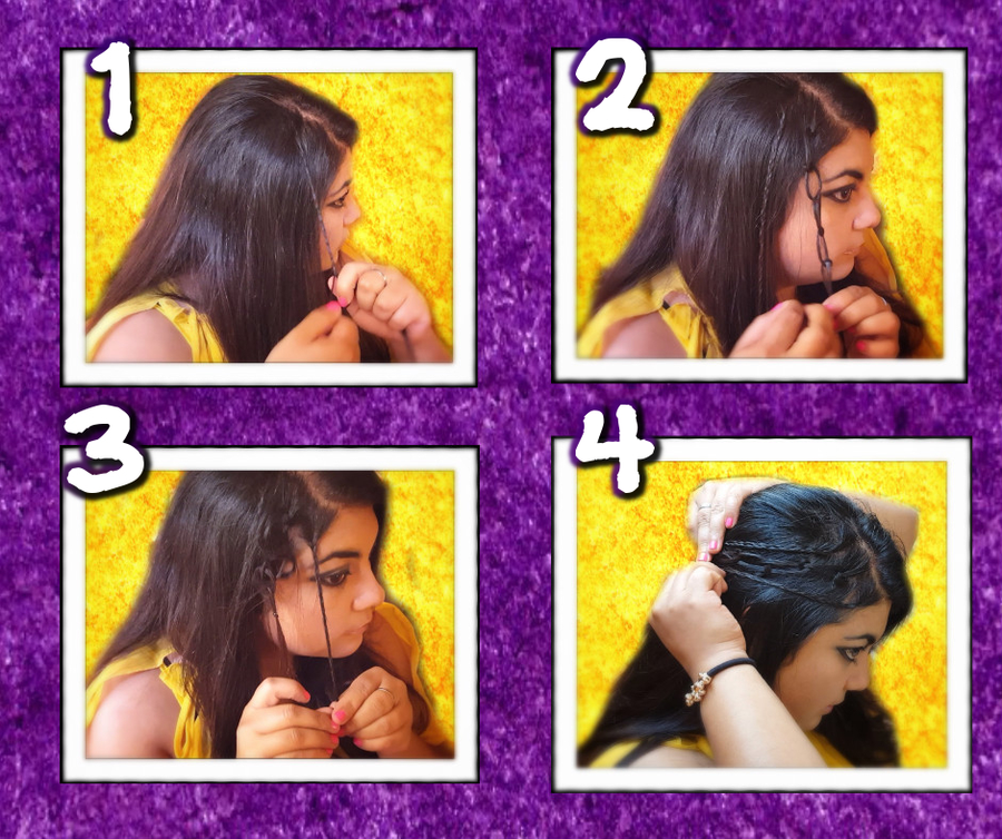 Paso 2. Tomamos otro mechón de cabello a la par de la trenza que ya hicimos, luego partimos en dos el mechón y comenzamos a hacer nudos, es decir como amarrar cordones, (pasa por abajo y luego cruza por encima y apretamos), así por todo el mechón, seguidamente al terminar el mechón del cabello lo amarramos con una goma.