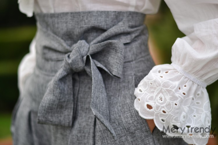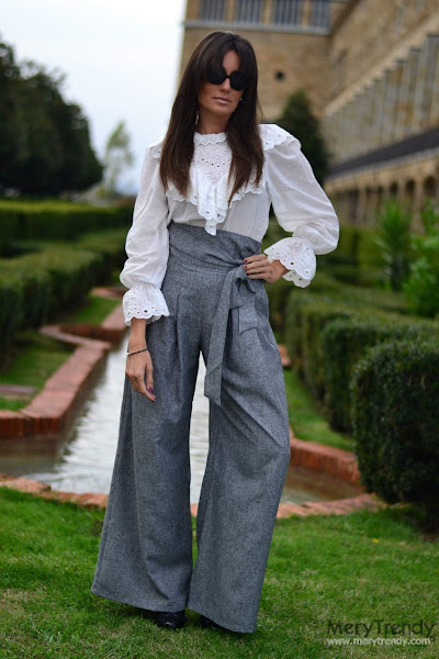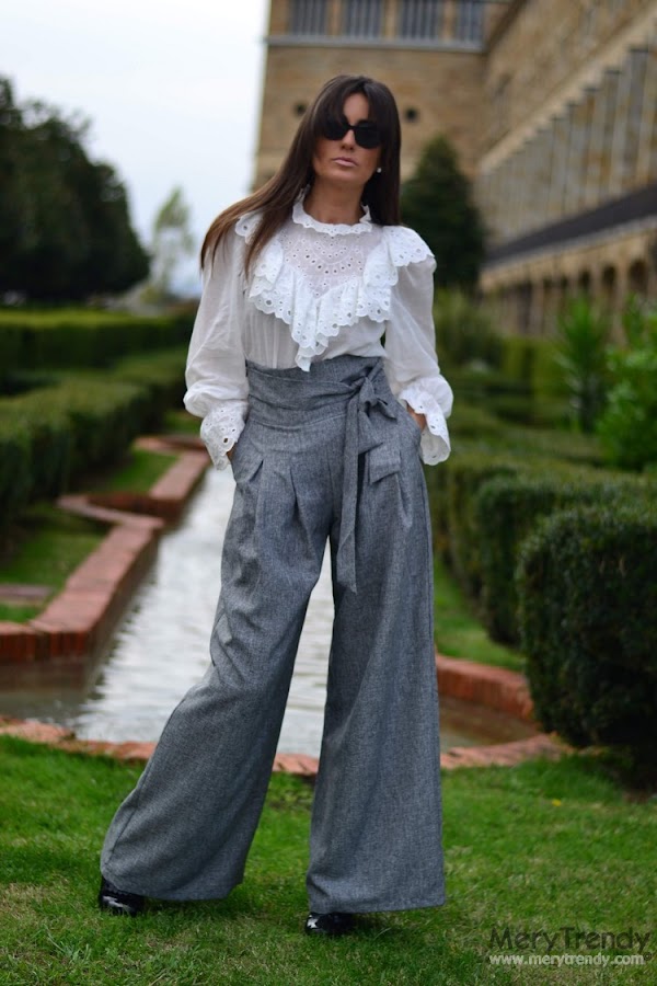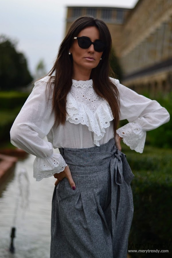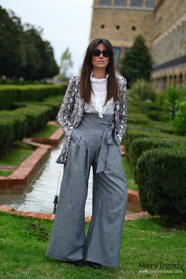 Como veis, en primera instancia, he apostado por conjuntarla con una blusa de algodón en color blanco con detalle de volantes, de manga larga y cuello redondo, y un pantalón plisado de vestir en color gris con pernera ancha, talle alto y cierre de cremallera invisible en un lateral, más arreglado, luciéndola en una de sus versiones más formales, pero también se me ocurre hacerlo con una cami más rockera o un look completo en negro.