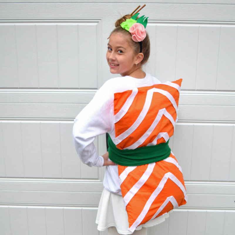 Ropa blanca para simular al arroz, y un cojín naranja para hacer del salmón atado a la cintura con un fajín. Unos palillos en la cabeza con una diadema hecha con fieltro y a darlo todo ;)