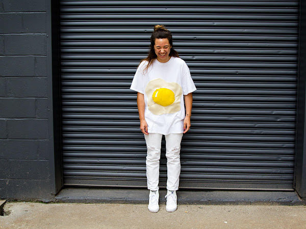 19. Disfraz de huevo con una camiseta blanca y fieltro