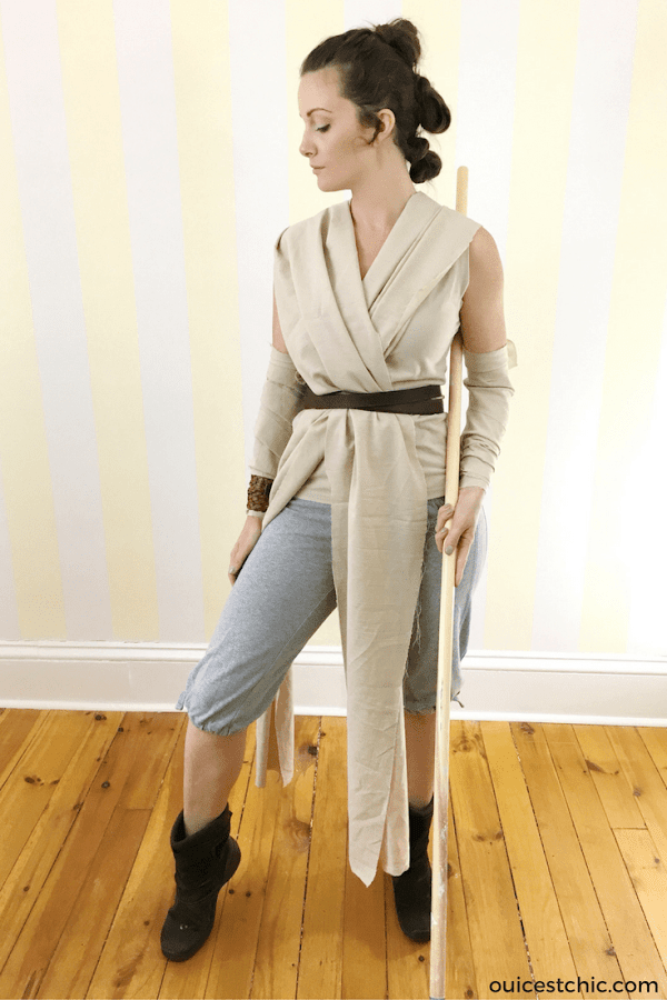 Tela tostada y un cinturón serán suficiente para conseguir el disfraz de la nueva jedi. Acompañarlo por un palo y un peinado con pequeños moños a lo largo de la cabeza.