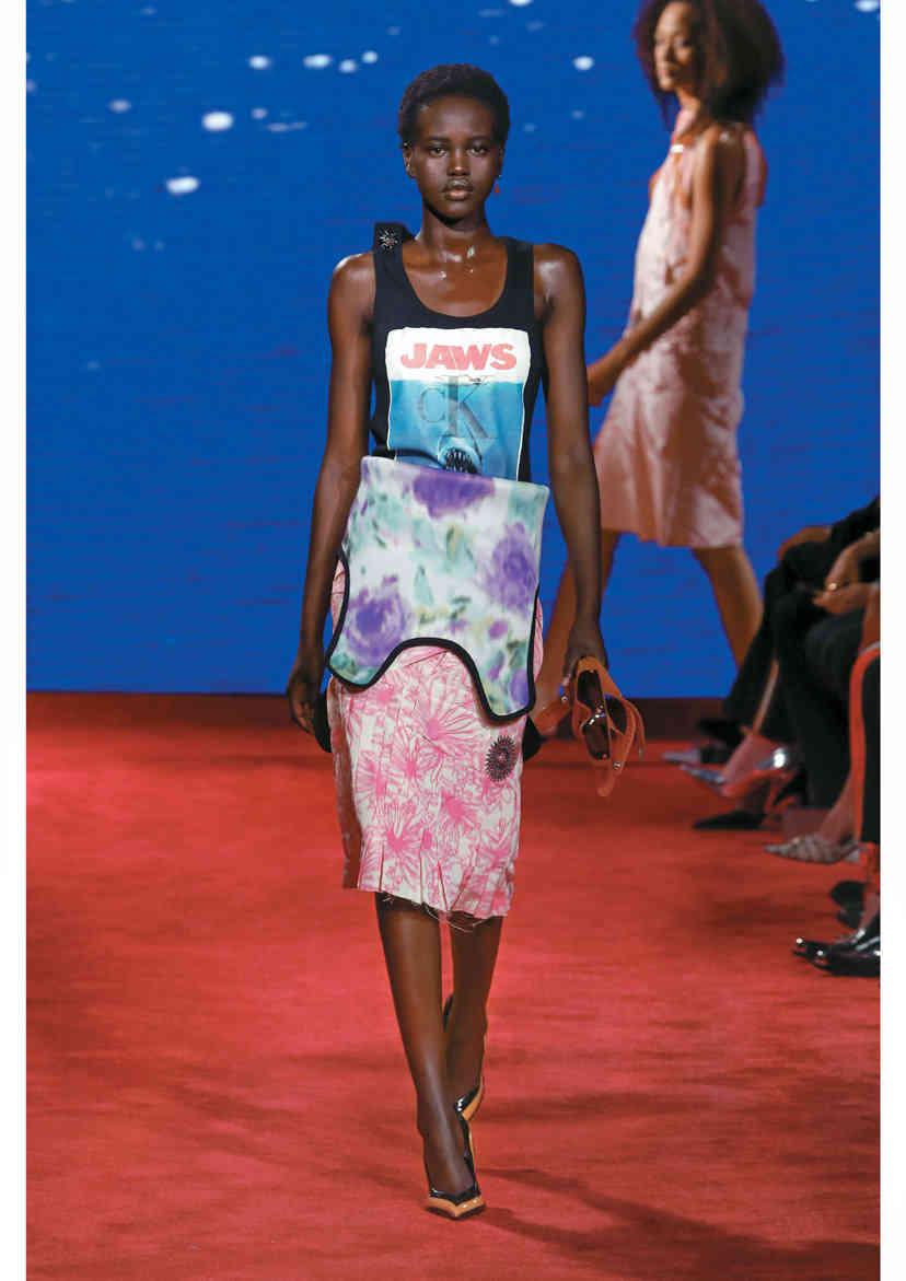 Raf Simons decidió que modelos hombres y mujeres explorarán el lado oscuro de Estados Unidos, el miedo y los peligros. Esta temporada la marca exploró una propuesta temeraria ambientada en la película Tiburón, con una alfombra roja que servía como la sangre de las víctimas. Hubo prendas de neopreno, faldas plisada, estampados florales, trajes de buceo y estampados de tigres y leopardos. Una mezcla extraña pero que sirvió para dar que hablar.