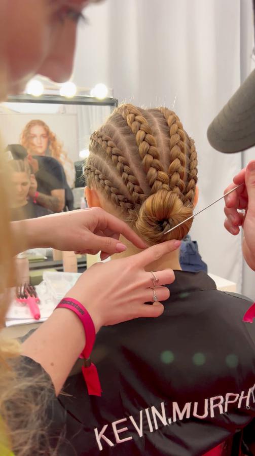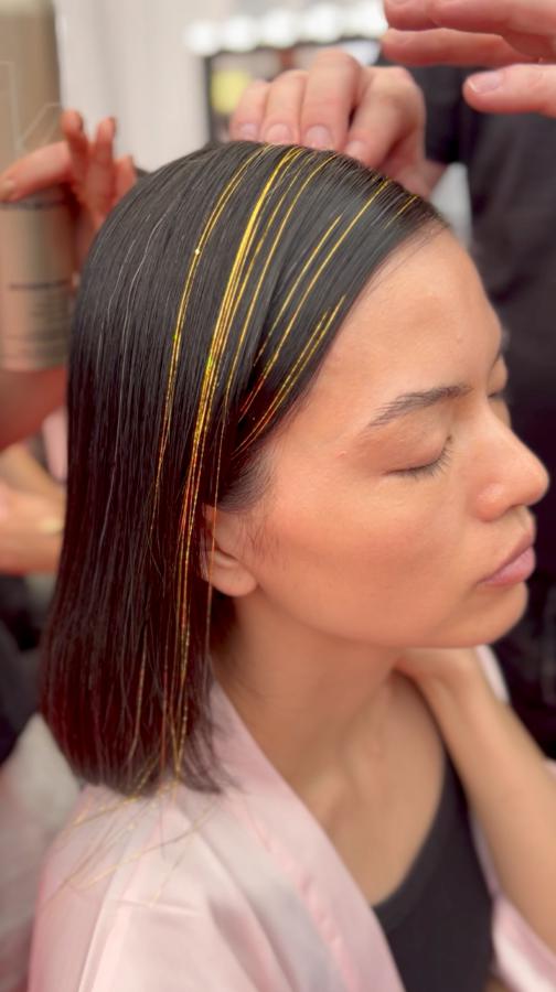 Romántico y femenino fue el desfile de Nicole Milano donde predominaron las melenas lisas con raya a un lado. El punto clave fue el brillo, en algunas modelos, se consiguió puliendo y aplicando spray de brillo shimmer propio de Kevin Murphy, en otras modelos, se utilizaron hilos dorados o complementos joya que sumaron un toque de elegancia.