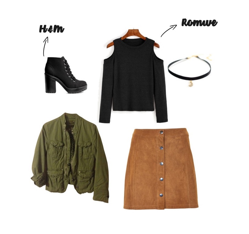 He combinado también este tipo de falda que se llevan un montón, tanto en vaquero como en tela felpa (creo que se llama), con esta camiseta que me gusto mucho el corte de los hombros, los botines de tacón y esta chaqueta en verde que me encanta.