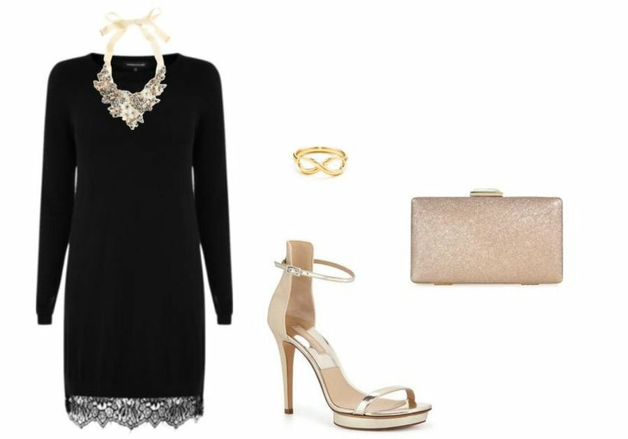 El color de la elegancia por excelencia siempre será el negro, por lo que no nos costará encontrar algún diseño adecuado para la ocasión. Nosotros damos un toque romántico a un diseño con puntilla mediante complementos en dorado, collar de flores, anillo con el símbolo del infinito y sandalias metalizadas, una de las opciones más elegantes en lo que a calzado se refiere.
