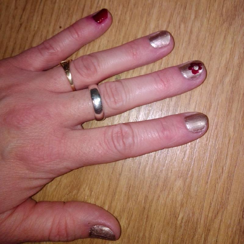 En la primera y la que más me gusta, he utilizado esmaltes de Avon, bueno, en casi todas he utilizado esmaltes de Avon, que son los que más tengo, en éste caso, un plateado con purpurina (Navideño total) con el que he pintado sólo las uñas de los meñiques y uno rosita pastel, con el que he pintado el resto de las uñas. Con un tono granate, he ido realizando diferentes motivos en cada una de las uñas centrales, por ejemplo, puntitos, flor o copo de nieve con ayuda de un pincel muy muy finito, dejando lisas tanto las meñique como los pulgares.