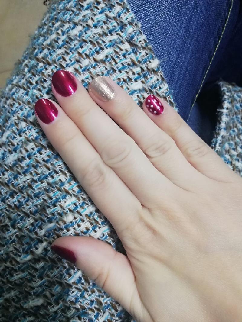 La segunda manicura es parecida, sólo que en éste caso he utilizado el esmalte granate de la anterior para pintar las uñas meñique y para la decoración, y para el resto de las uñas un tono dorado precioso y muy navideño ambos con mucho brillo.